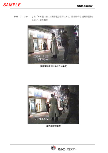 調査が完了しましたらご報告書をお渡しいたします。私たちの唯一の商品になるのがこういった報告書なのです。報告書は以下の様な書式で写真、時間、取った行動、場所や地図、人物の特徴などを細かく記述しています。